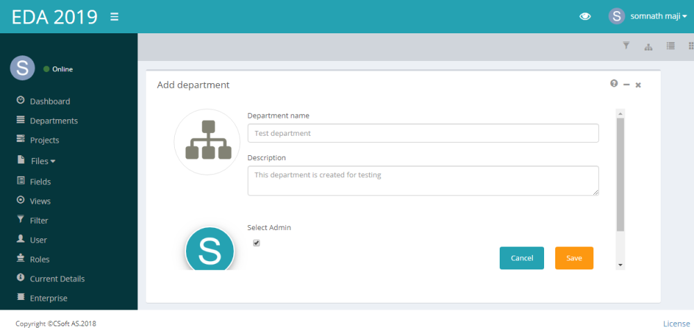 In this section,we will learn the steps for adding a department.The required fields to add a departments are :Department name,Department description and Admin.To add a department,navigate to Dashboard>Department and complete the following steps: