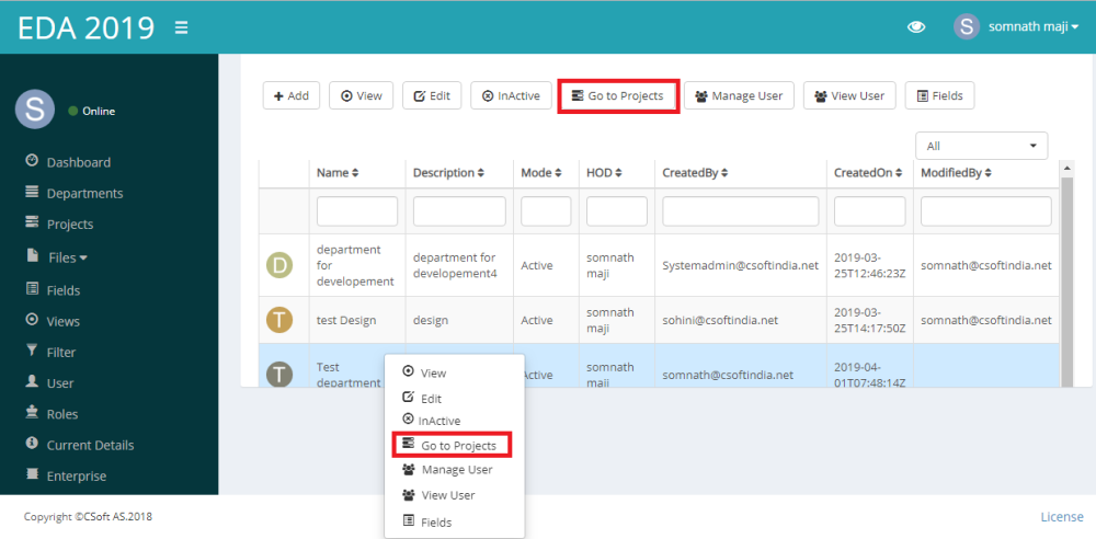 We can add projects to a department by this option. To access the option, the user has two alternative options. She can either select department by left click of the mouse button. The Go to projects option is then listed as buttons on top of the list control.