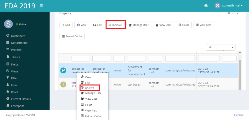 A project can not be deleted,it can be made inactive by Inactive option.To access the option, the user has two alternative options. User can either select project by left click of the mouse button. The Inactive option is then listed as buttons on top of the list control.