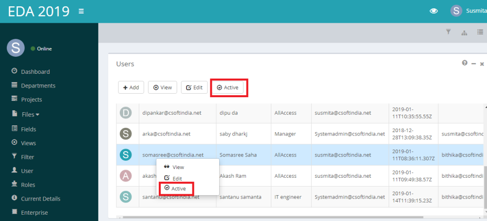 A User can be made Active by Active option.To access the option, the user has two alternative options. User can either select User by left click of the mouse button. The Active option is then listed as buttons on top of the list control.