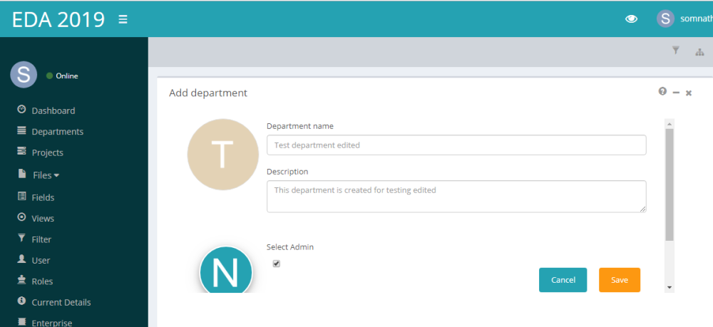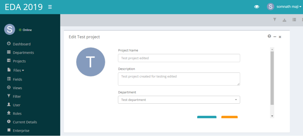 A saved project can be edited here.We can change the project name,Description only.The department name is not allowed to modify.