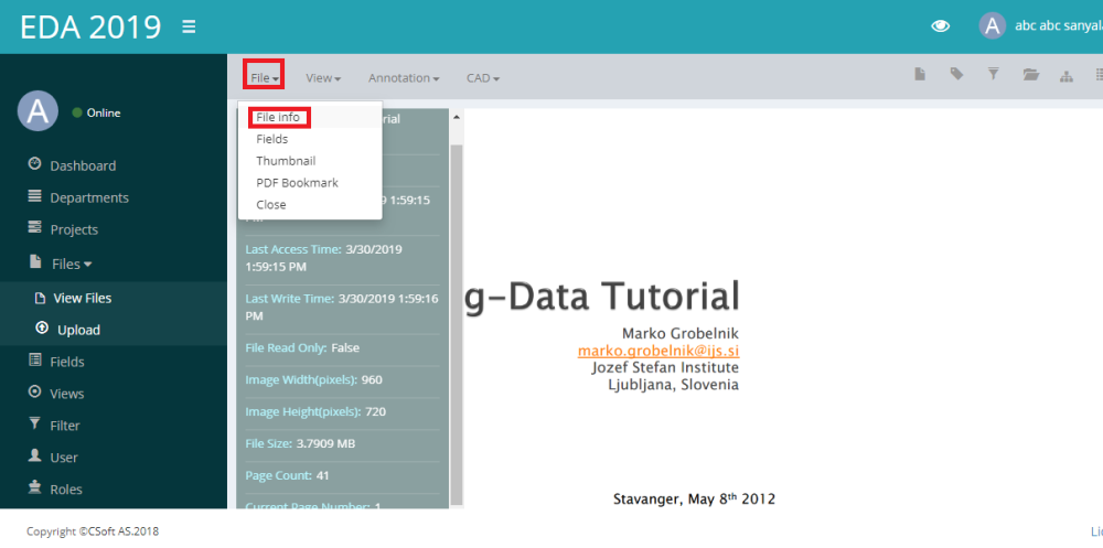 In EDA we can view file name,file format,size,creation time,last access time,read only status,last write time,file related fields (Fields.) To view a file information,here is the following steps: