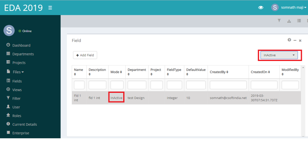 If a field is made inactive then it will go to the inactive list.And we can view the inactive list of fields by selecting Inactive option from the drop down list at the right side corner of the page.
