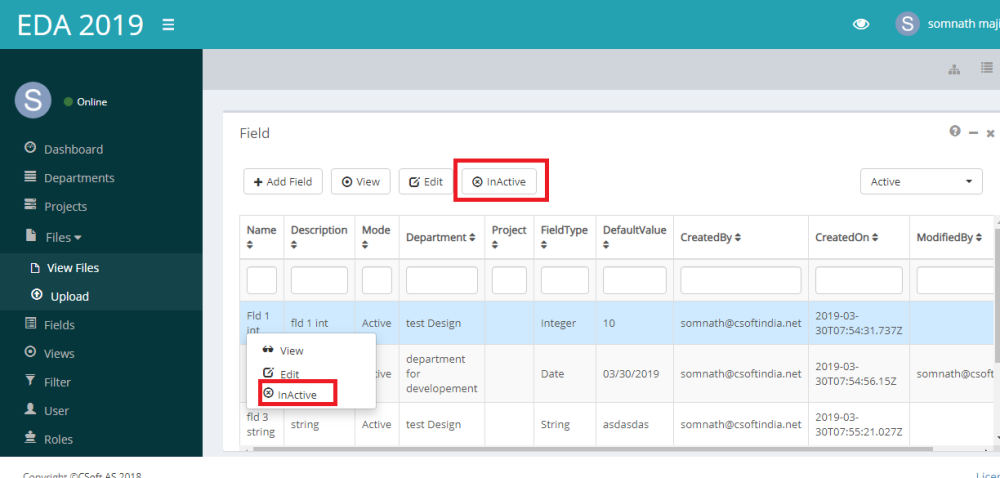 User can also right click on the Field and Inactive option is then listed as the context menu.