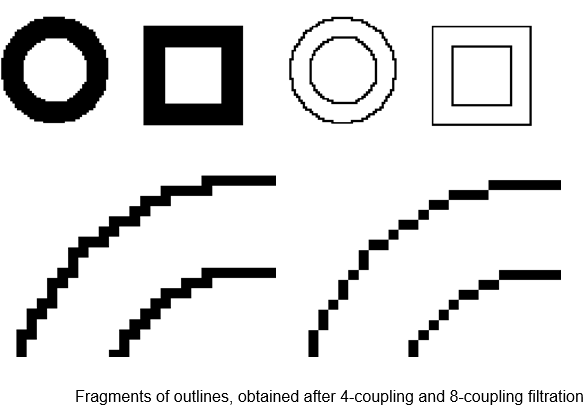 Contour filters convert filled raster areas of the image to one-pixel outlines. The 4-coupling filter creates 4-coupling contour; the 8-coupling filter creates 8-coupling contour. In the 4-coupling filter the contiguous areas can only be coupled with their sides; the 8-coupling filter analyses corner contiguity, so such images look thinner.