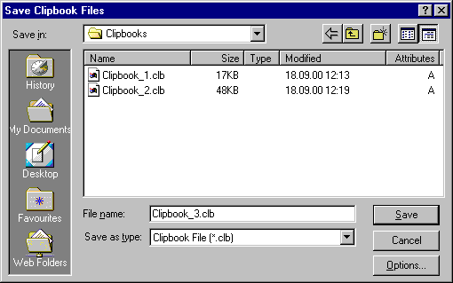 Using the Clipbook toolbar or cursor menu the contents of a Clipbook can be saved in a disk file, and then restored from file.