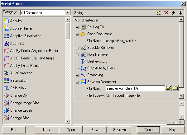 2. Using standard drag and drop techniques; populate the Script window in the dialog with the desired operations from the list in the left hand side. Press the key with the first letter of command name to speed up this process. To work with a list of commands, use the Category list in which commands are grouped by menu items (File, Edit..)