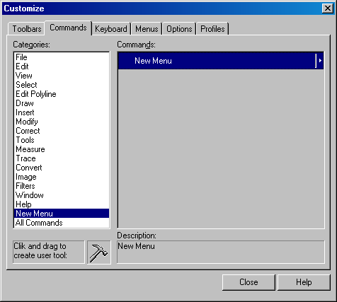 6. Select All Commands in the Categories list of Customize > Commands dialog. Drag commands from the Commands list to the new menu. Use the right mouse button to create or remove separator lines.