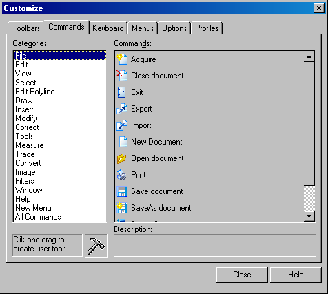 2. Drag a command from the list to any toolbar or menu with the mouse.