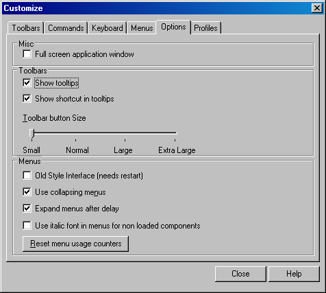 | Reset menu usage counters button | Resets the original menu structure, i.e. cancel the order of commands in a menu list depending on the frequency of their usage. |