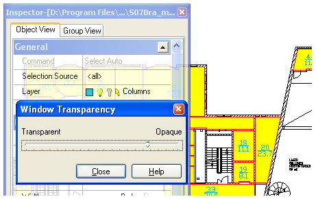 To make a toolbar or dialog transparent, move the cursor onto the desired one and then right-click with the CTRL pressed. When the Window Transparency dialog is displayed, use the slider to set this parameter.