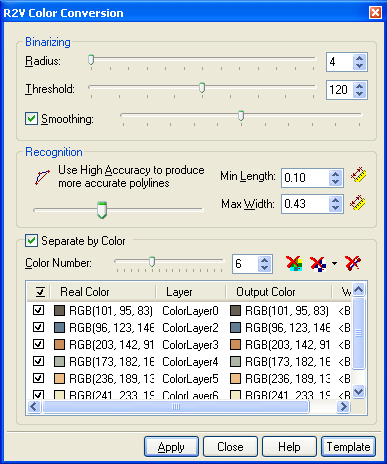 Set the Colour Number value (usually 1-2 colours more than the real number). The program automatically defines the table of colours and casts the colour of an object to the nearest one. By switching on/off the Export to Layer checkbox located at the beginning of every colour table string, all objects of this colour can be checked visually.