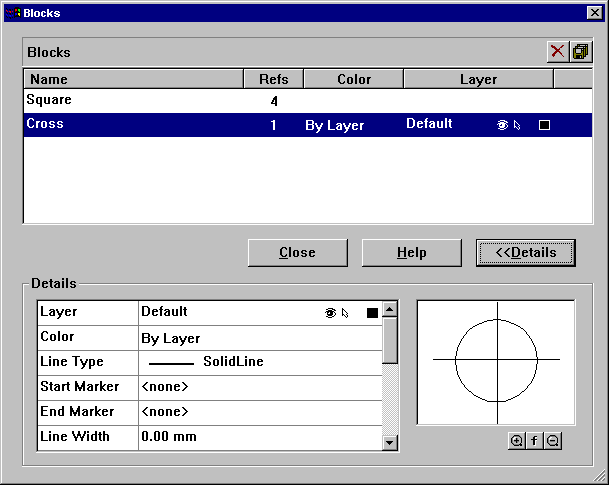 The Refs field contains the number of block insertions in the document. The value 0 in Refs means that the block definition is stored, but the block has not been inserted in the document. To delete a definition, allocated for block storage, press the button