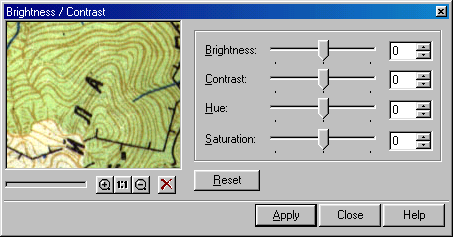 Modifying contrast enables the image brightness range to be increased or reduced. An image with the same brightness value has zero contrast value. If the contrast value increases, then it causes an increase of the brightness range, i.e. darkening dark colors and lightening light ones. Image contrast is measured in percent ranging from 0% (fully grey) to 100%. Color hue usually means a colour, and saturation means colour purity. There is the ability to fully modify an image colour.