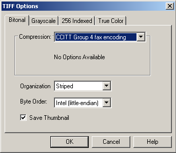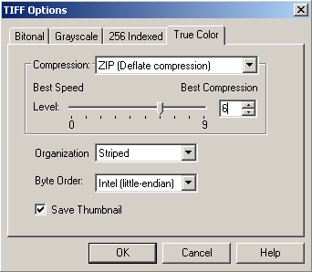 | Compression | Sets compression and compression options: No Compression (All) CCITT modified Huffman RLE (Bitonal) CCITT Group 3 fax encoding (Bitonal) CCITT Group 4 fax encoding (Bitonal) Macintosh RLE (All) ZIP (All) JPEG DCT (Greyscale and True Colour) |