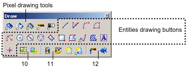 The second row contains main drawing tools, a button (8) that switches raster/vector drawing mode (see page 299) and coordinate system setup button (9).