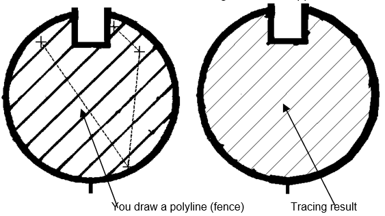 To trace a hatch, draw a polyline crossing all the lines which form the raster hatch. The program automatically detects the boundary of the hatched area and creates a hatch.