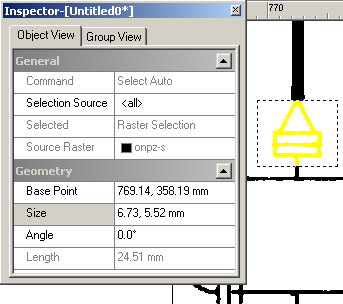 The Inspector window is shown when a part of a raster object is selected. The selection can be moved, Base Point changed, resized by modifying values in the Size box, and rotated by defining them an angle in the Angle field.