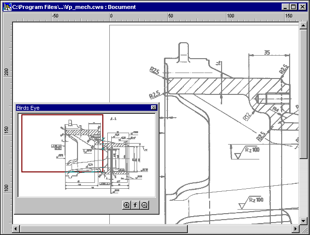 The Birds Eye window contains a view of the document, a red rectangle that represents the part of document shown on the screen, and zoom buttons. Moving the red rectangle pans the document. The selected area fits to the screen boundaries. At the lower right of the window are three buttons. The two zoom buttons allow the details within the red rectangle to be seen without zooming the image. The Fit